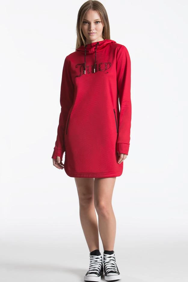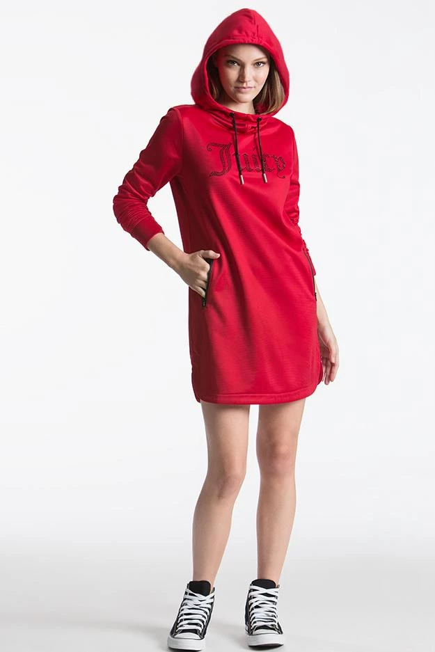 Combining comfortable athletic wear and fashion, this Juicy big bling oversized hoodie dress will not go overlooked. Bonus: kangaroo zip pockets.