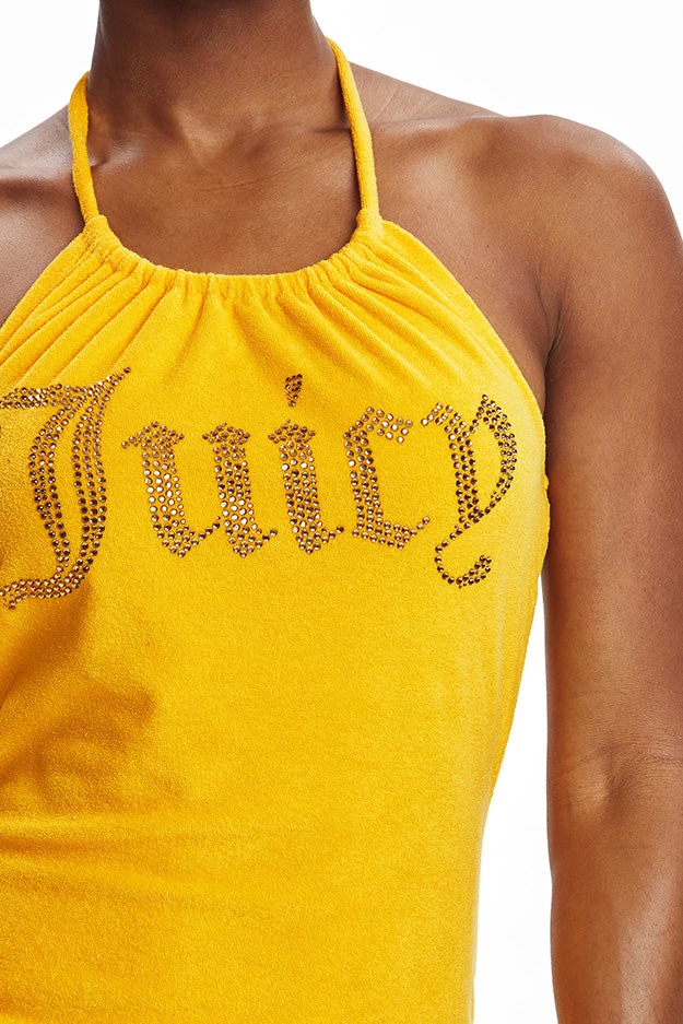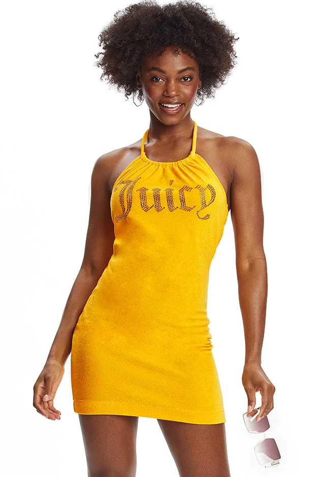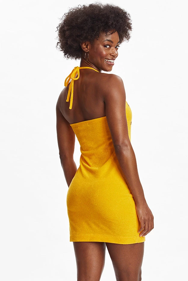 The towel terry mini dress of your dreams. The 90’s inspired bodycon fit with halter neckline will take you from poolside to party in seconds.