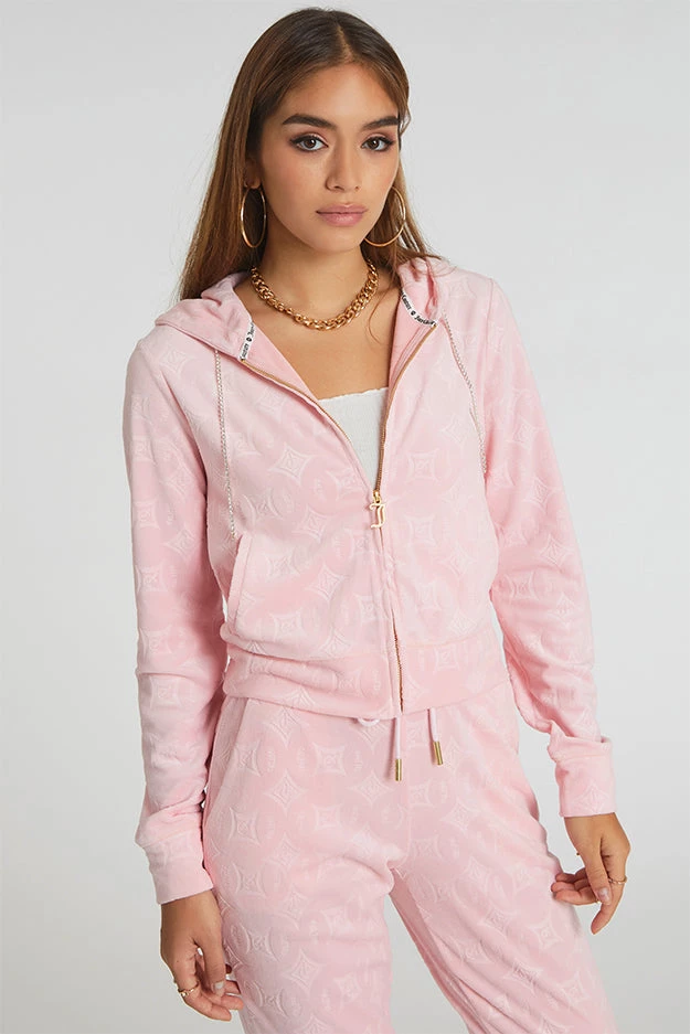 Throwback to our zip-up jacket cut from our cozy luxe velour fabric. Finished with embossed Juicy logos throughout and bling drawstring to add pizzaz.