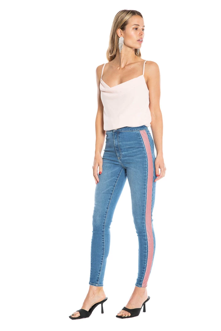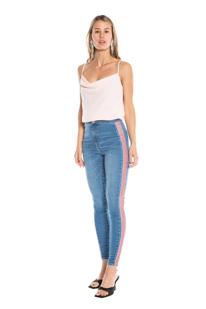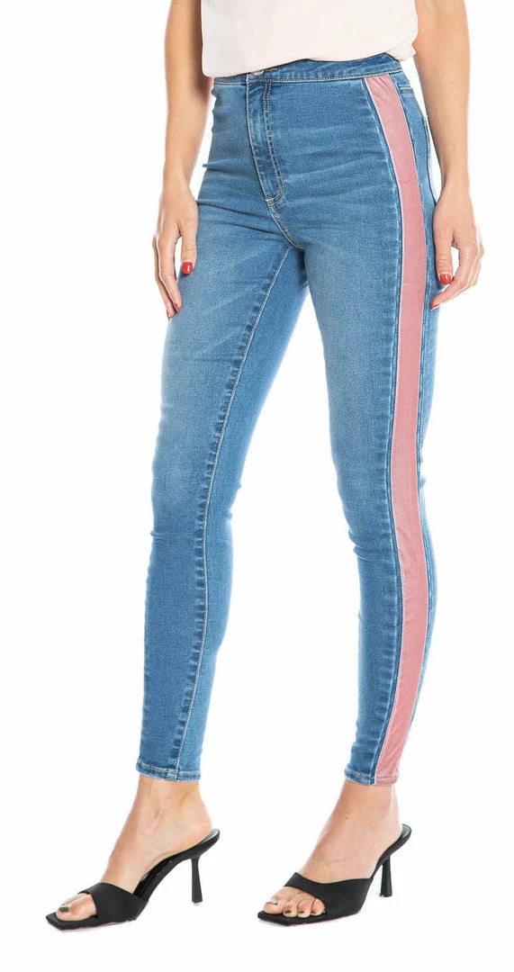 Step into the night with these rosey velvet striped skinny jeans. This jean features a super-soft velvet tape along the side seam for a romantic pop of color. The power-stretch fabric holds you in all day and night.