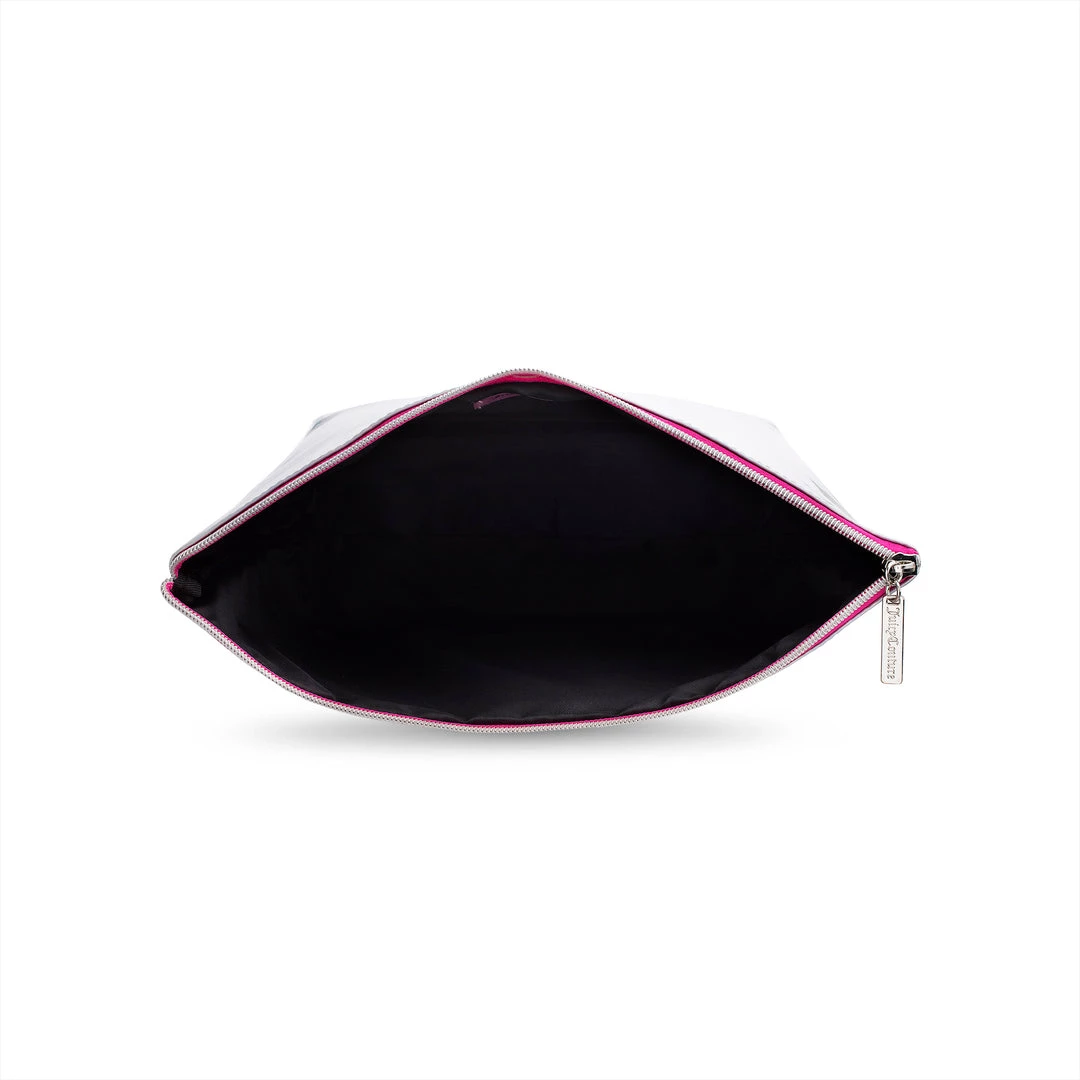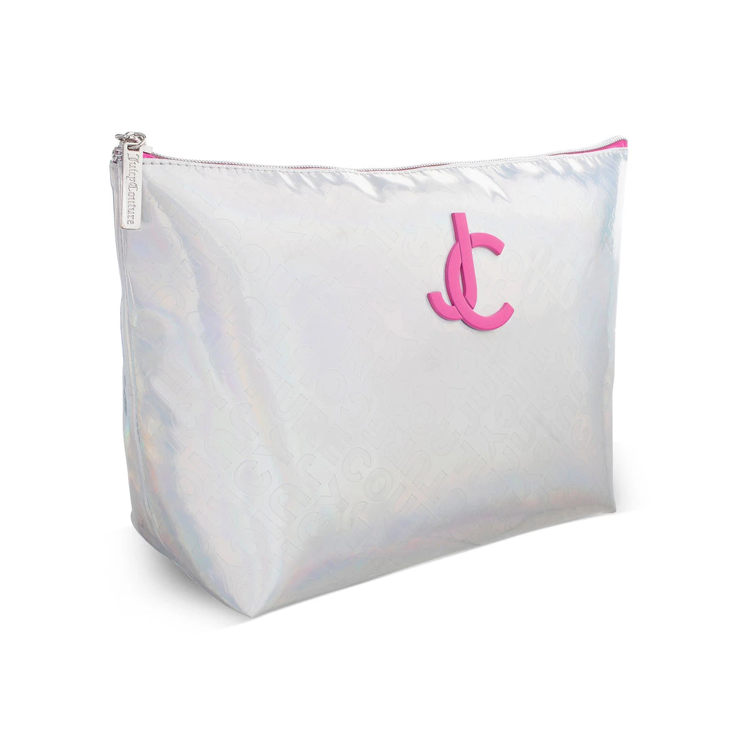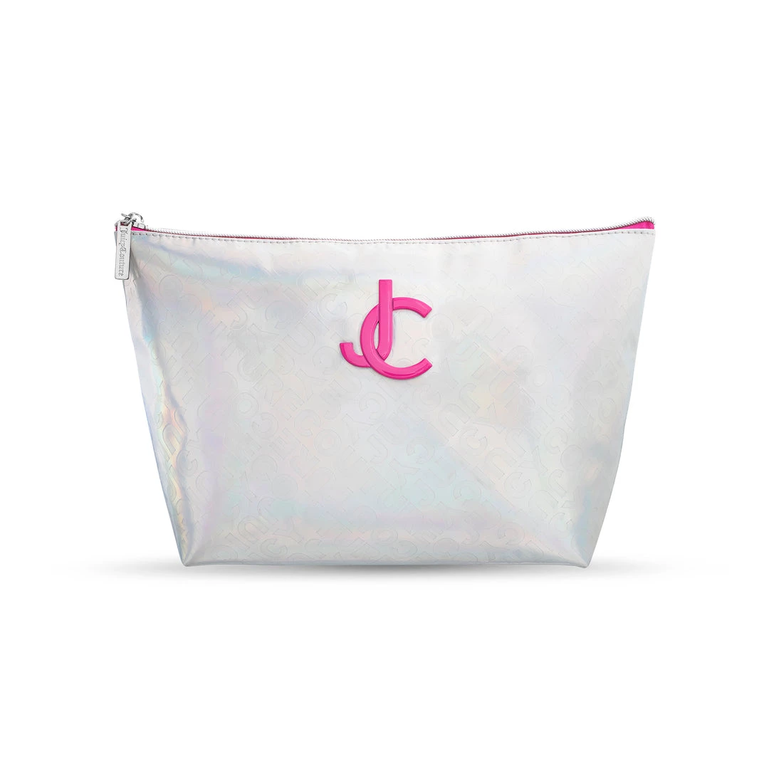 Modern juicy couture embossed logo top zip cosmetic bag with bright pink details.