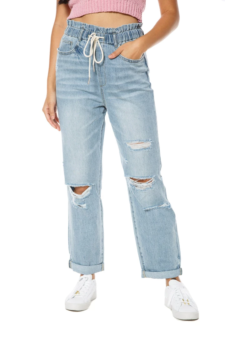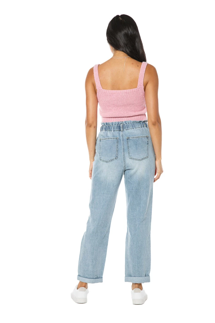 Loose-fitting with a paper bag waist and wider leg opening, you’ll have maximum comfort in these retro washed jeans all day long!