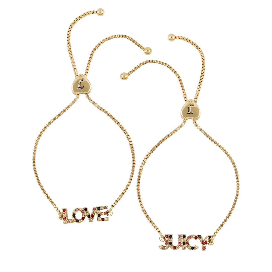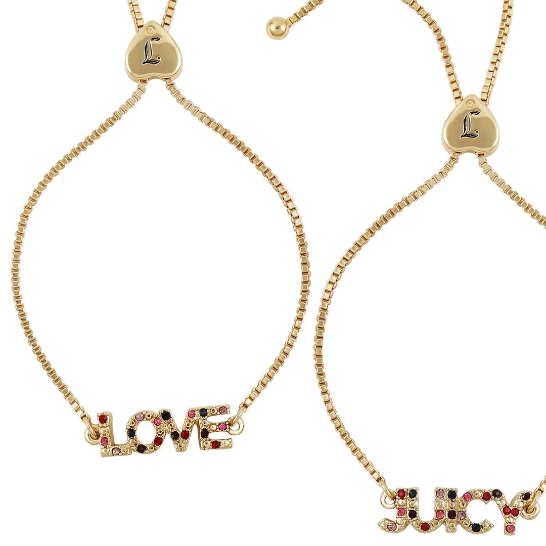 Love and “Juicy” text are the centerpieces of these charm slider bracelets. Juicy Couture logo is featured on the sliders. A member of the Sugar Crush collection.