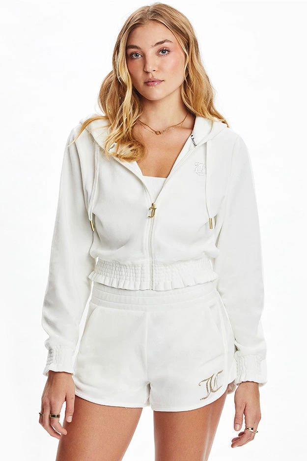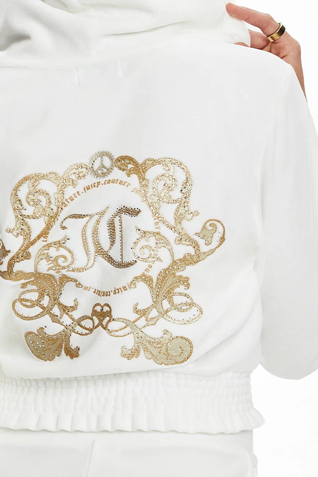 Just in time for warmer weather, our cozy cotton velour hoodie gets a flattering update courtesy of a waist-accentuating smock hem and foil back graphic.