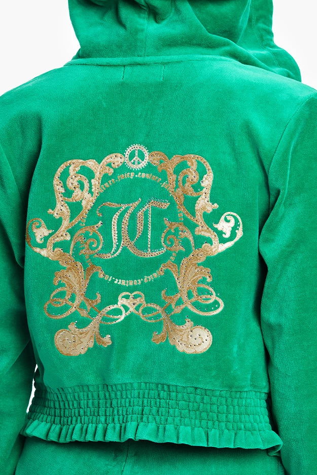 Just in time for warmer weather, our cozy cotton velour hoodie gets a flattering update courtesy of a waist-accentuating smock hem and foil back graphic.