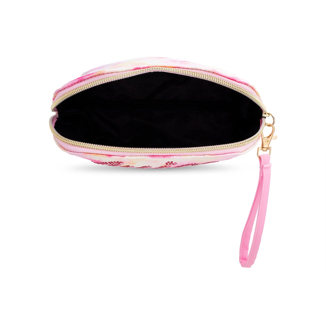 This tie dye print juicy cosmetic wrist pouch is the perfect size to carry alone or fit inside your handbag.