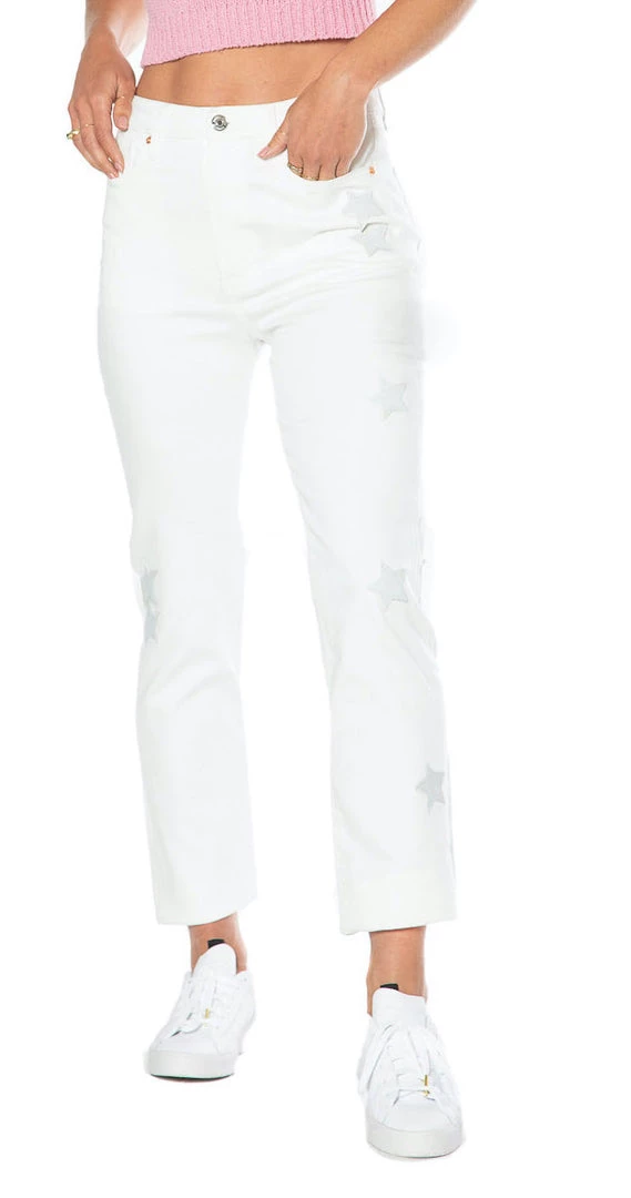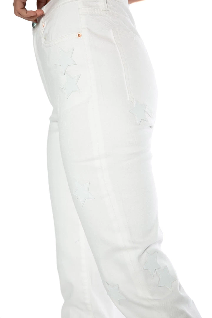 Make a bold statement with these faux leather star appliques! These straight jeans have slightly stretched fabric has an authentic look with a comfortable fit that molds to your body.
