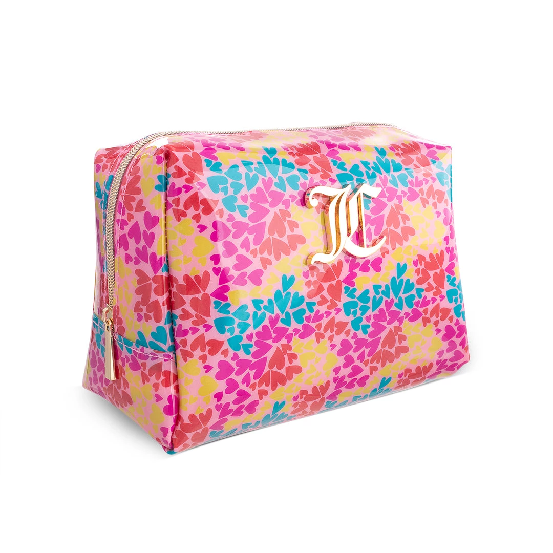 Classic wedge shaped cosmetic bag with a beautiful heart print and classic juicy hardware. We heart it and so will you!