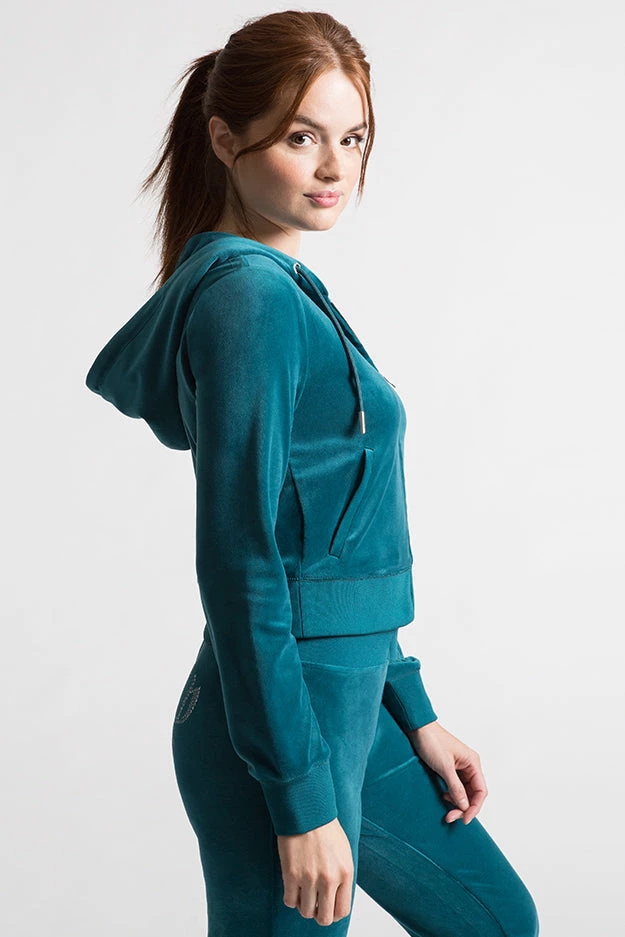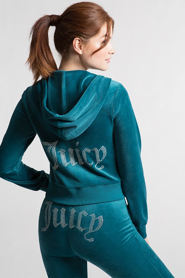 Our iconic Y2K bling hoodie is back! This luxe velour zip front jacket features the gothic “J” pull zipper, kangaroo pocket, and thumbholes.