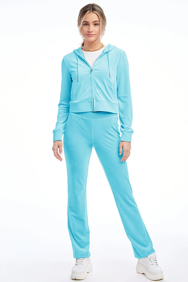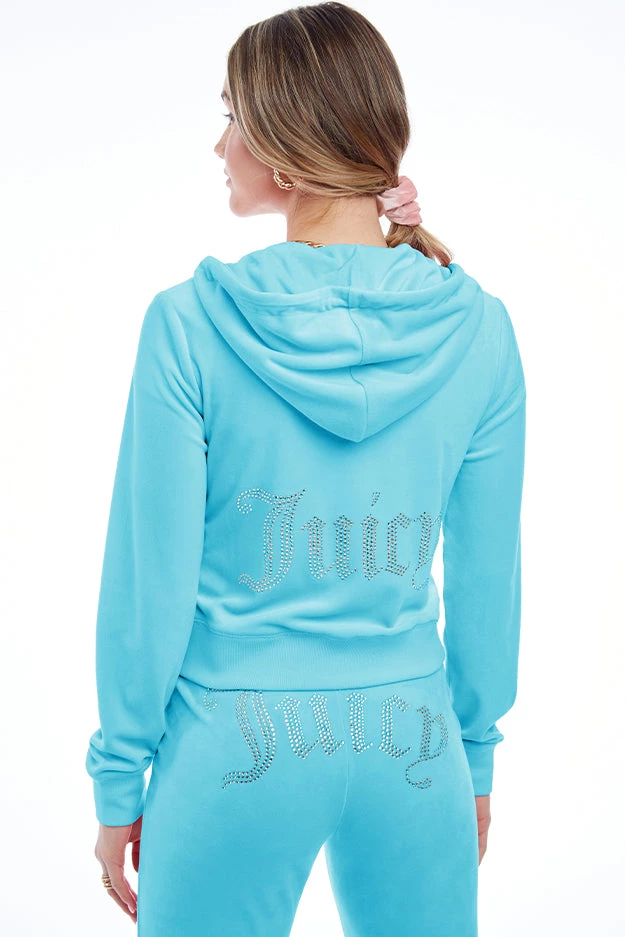 Our iconic Y2K bling hoodie is back! This luxe velour zip front jacket features the gothic “J” pull zipper, kangaroo pocket, and thumbholes.