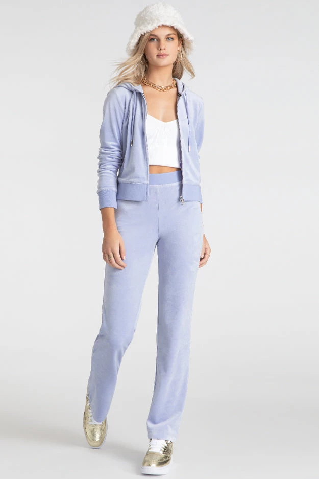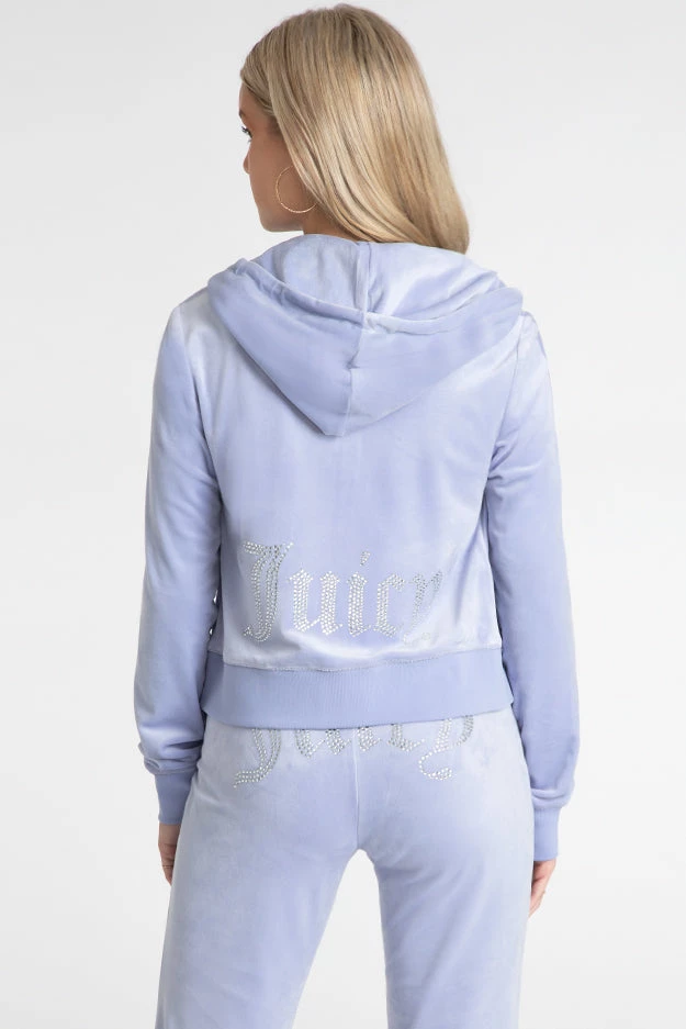 Our iconic Y2K bling hoodie is back! This luxe velour zip front jacket features the gothic “J” pull zipper, kangaroo pocket, and thumbholes.