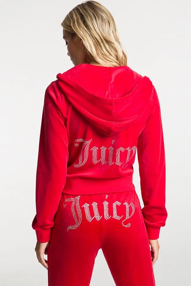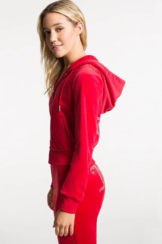 Our iconic Y2K bling hoodie is back! This luxe velour zip front jacket features the gothic “J” pull zipper, kangaroo pocket, and thumbholes.