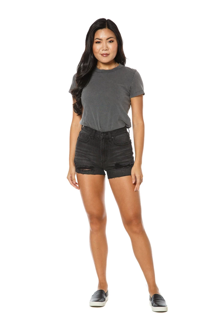 Our high-rise, formfitting short in a classic black wash. The comfort fabric has a slight stretch to keep you comfortable while still maintaining that authentic look.