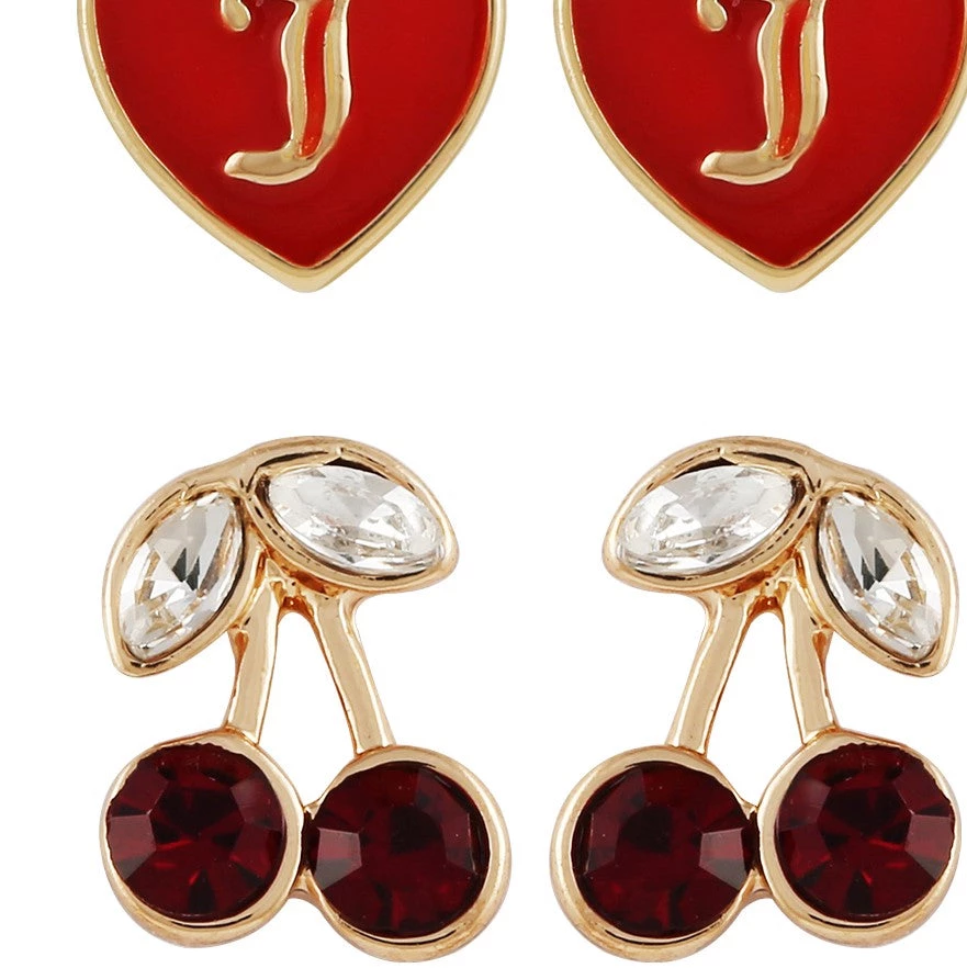 Accessorize your look with any of these earrings: a shining crown, scarlet “J” engraved heart or glass stone topped cherries. A member of the Perfectly Pretty collection.