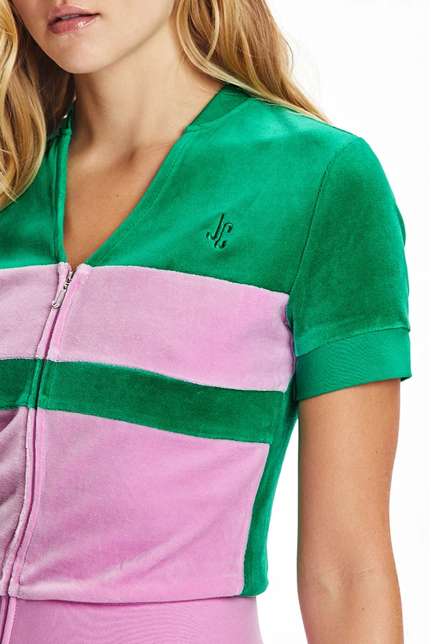 Our track jacket gets a short sleeve look with this colorblocked v-neck zip-up.