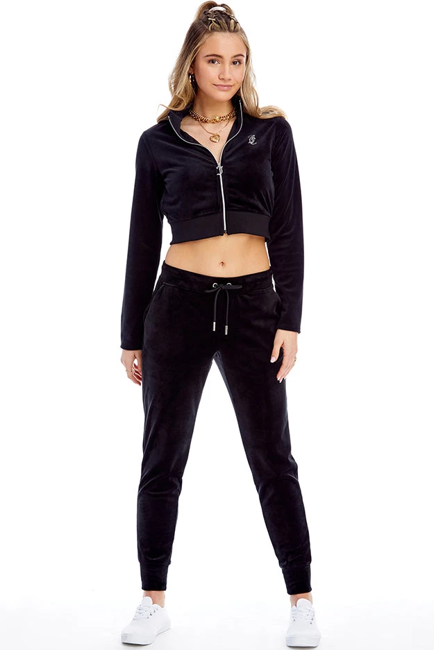Keep it cozy on your way to and from every day activities, our mockneck velour jacket guarantees the perfect cropped length with just a hint of bling.