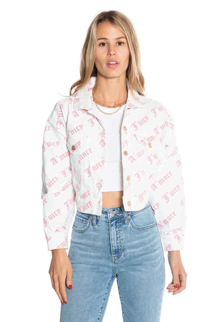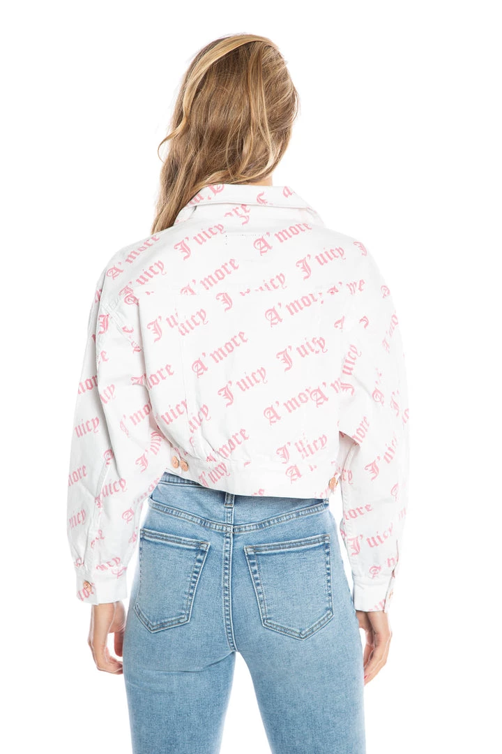 Amore Juicy! We sure do. Express your love with this pink and white printed signature denim jacket featuring an oversized crop fit.