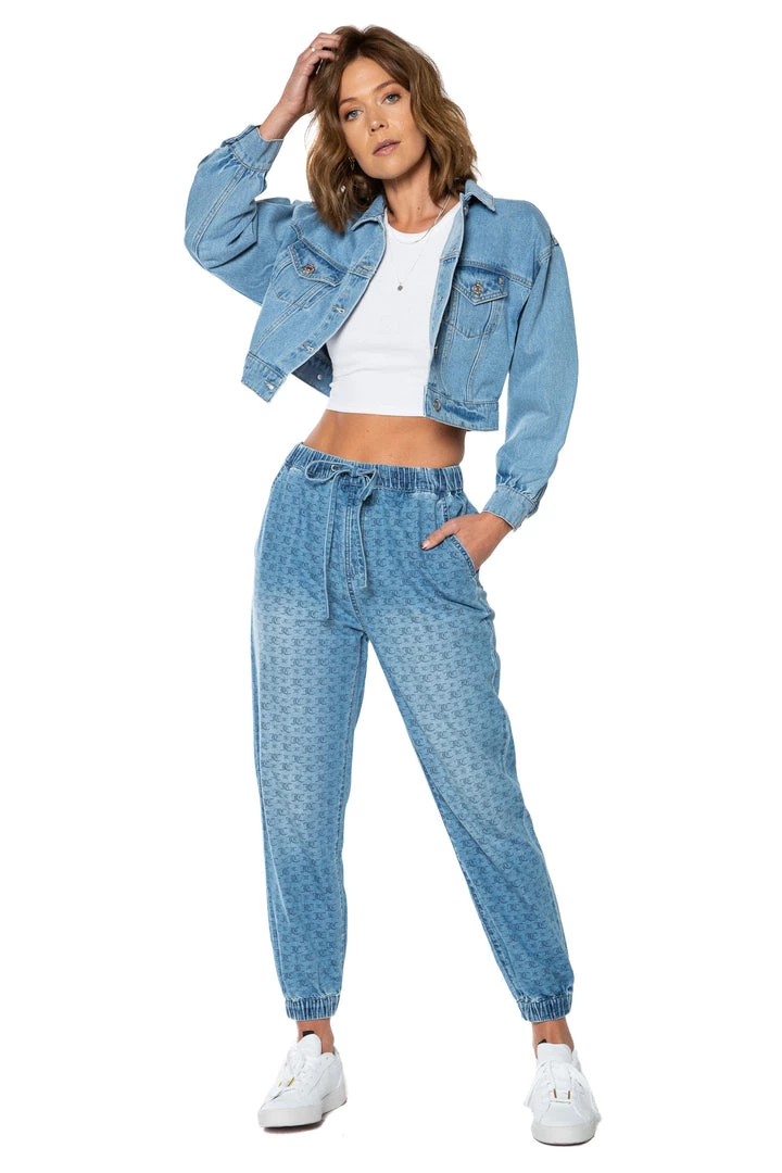 Show your Juicy love with this all over micro JC printed jogger! Easy weekend outfits have never been so stylish. Drawstring waist and elastic hem.