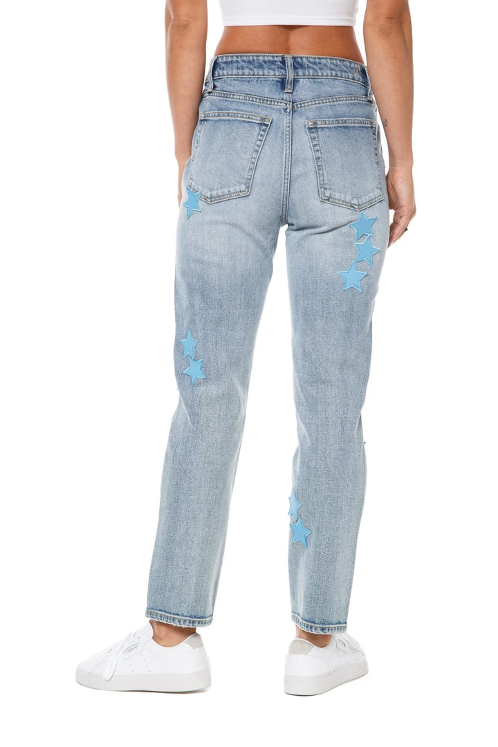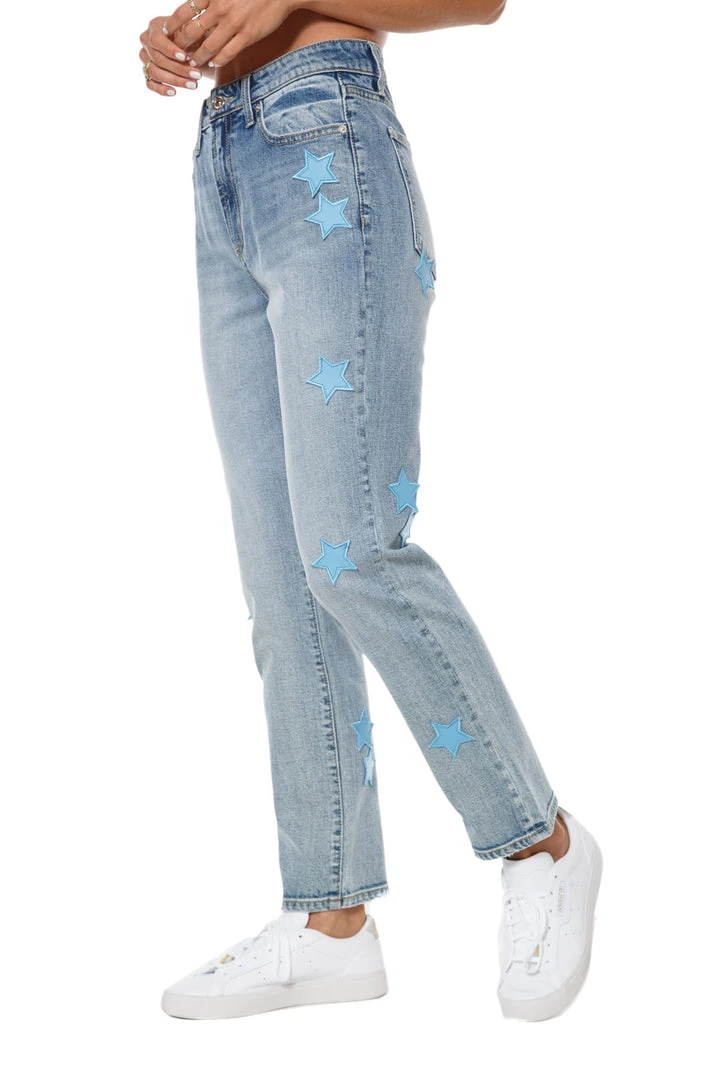 Make a bold statement with these faux leather star appliques! These straight jeans have slightly stretched fabric has an authentic look with a comfortable fit that molds to your body.